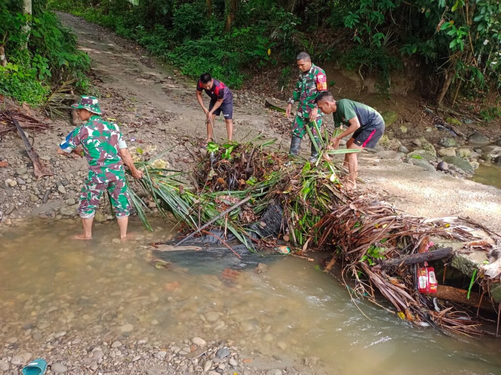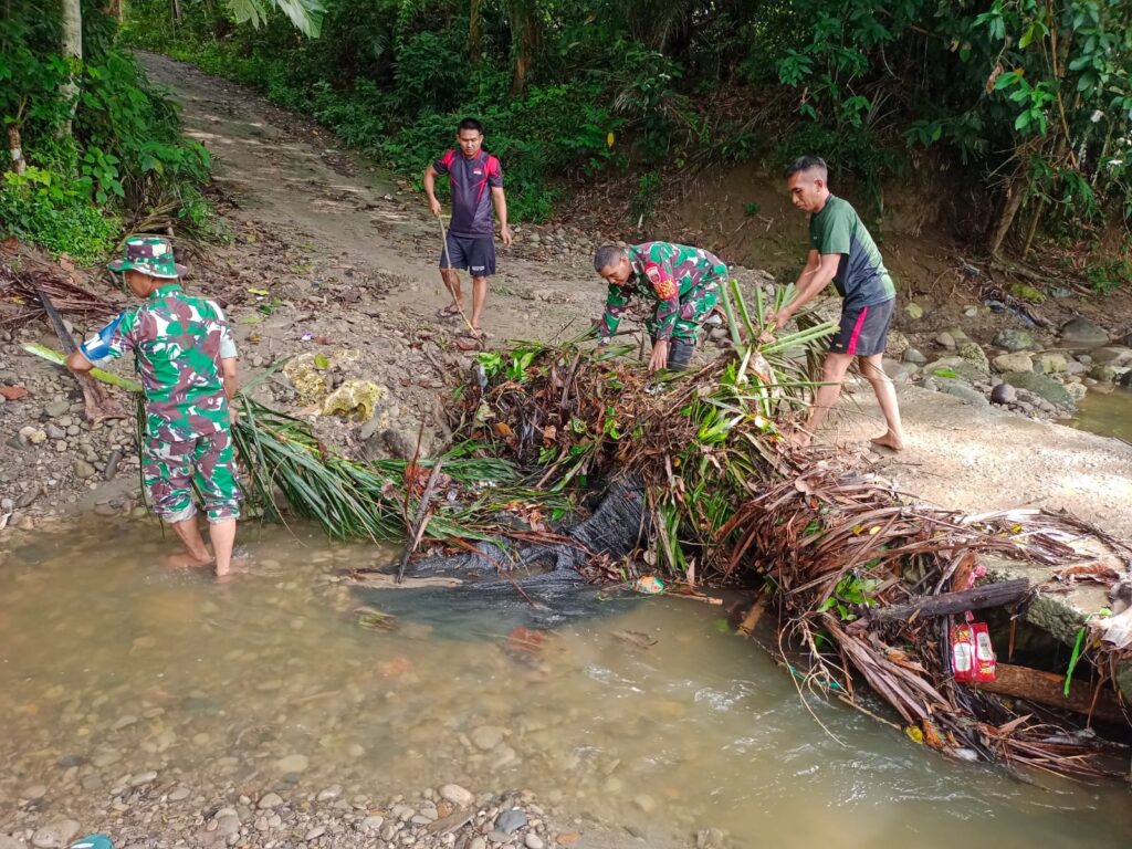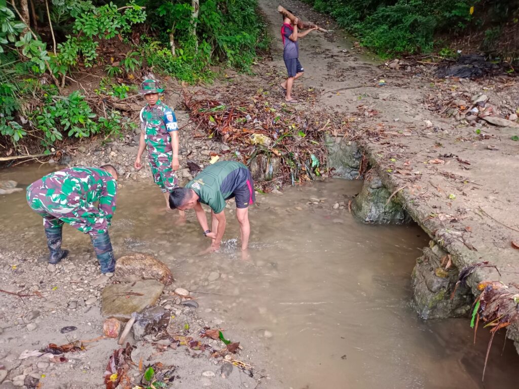 independennews.id (Polewali Mandar) — Anggota Satgas TMMD Ke 116 Kodim 1402/Polman Bersihkan sampah untuk memperlancar aliran sungai, yang menyumbat tepat di jembatan limpas Dusun Beru-Beru, Desa Ongko, Kecamatan Campalagian.