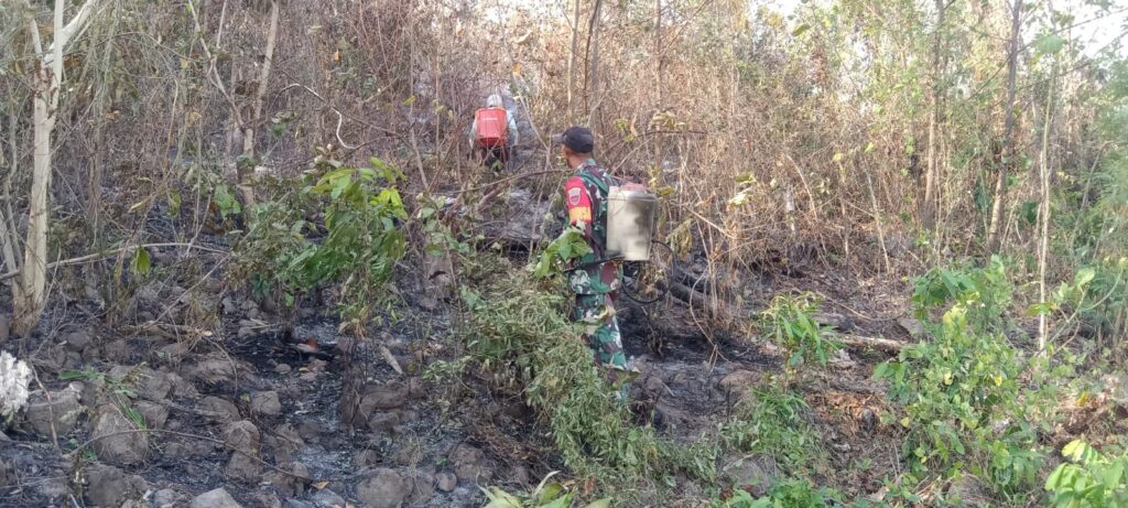 Babinsa Kodim 1402/Polman Bersama Babinkamtibmas dan Warga Padamkan Api Yang Membakar Lahan Milik Warga Di Polman