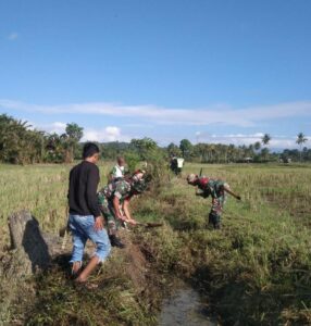 independennews.id (Polman) — Anggota TNI dari Koramil 1402-03/Campalagian bersama warga lakukan kerja bakti pembersihan saluran irigasi persawahan menjelang olah lahan persawahan.