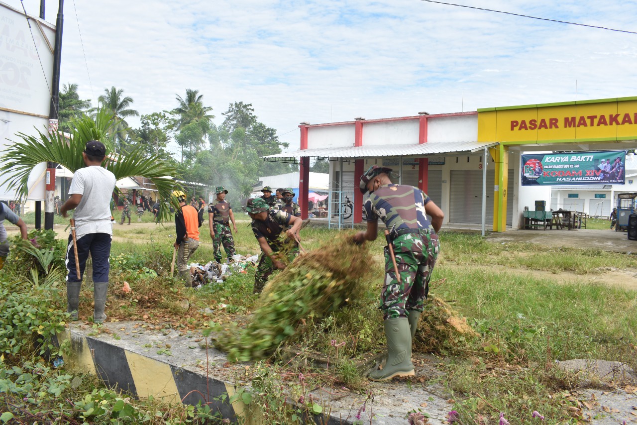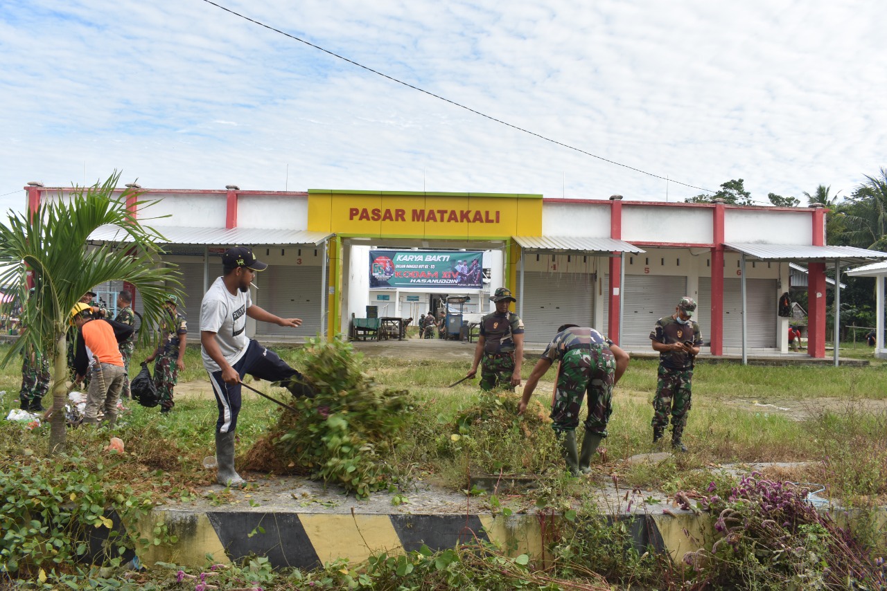 POLMAN- Sejumlah anggota TNI dari Kodim 1402/Polman Bersama Polri serta masyarakat melakukan karya bhakti membersihkan Pasar Tradisional Matakali, di Kecamatan matakali, Kabupaten Polewali Mandar.