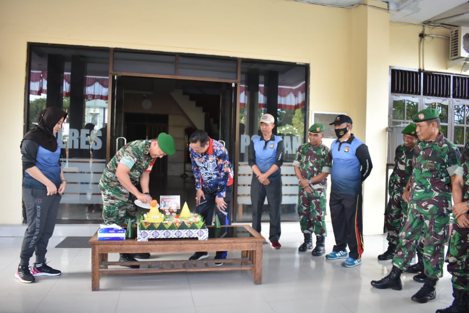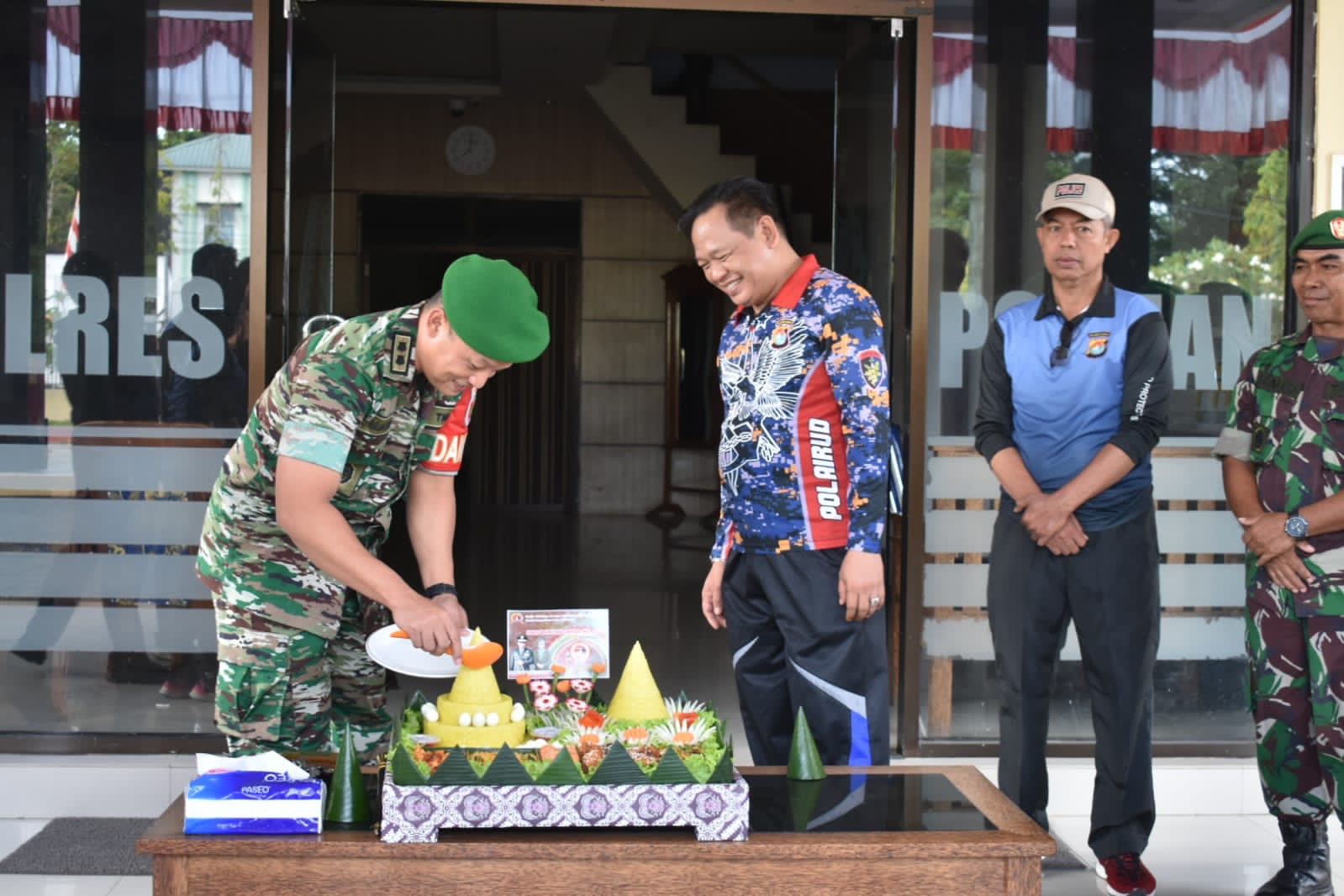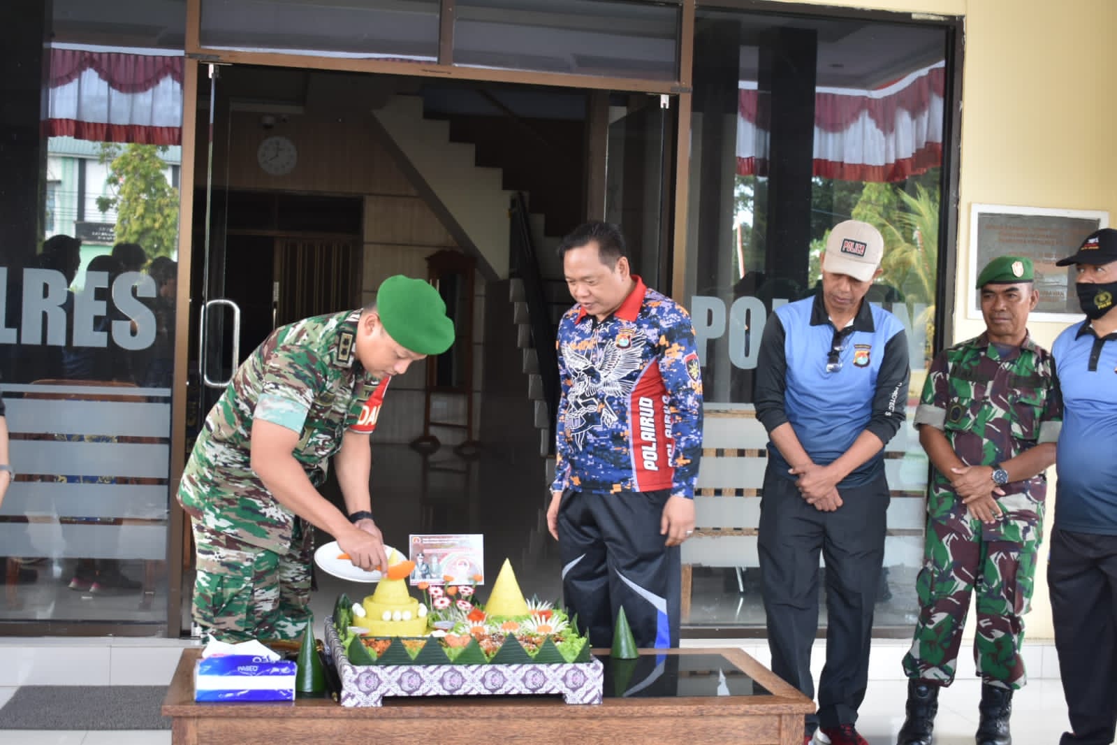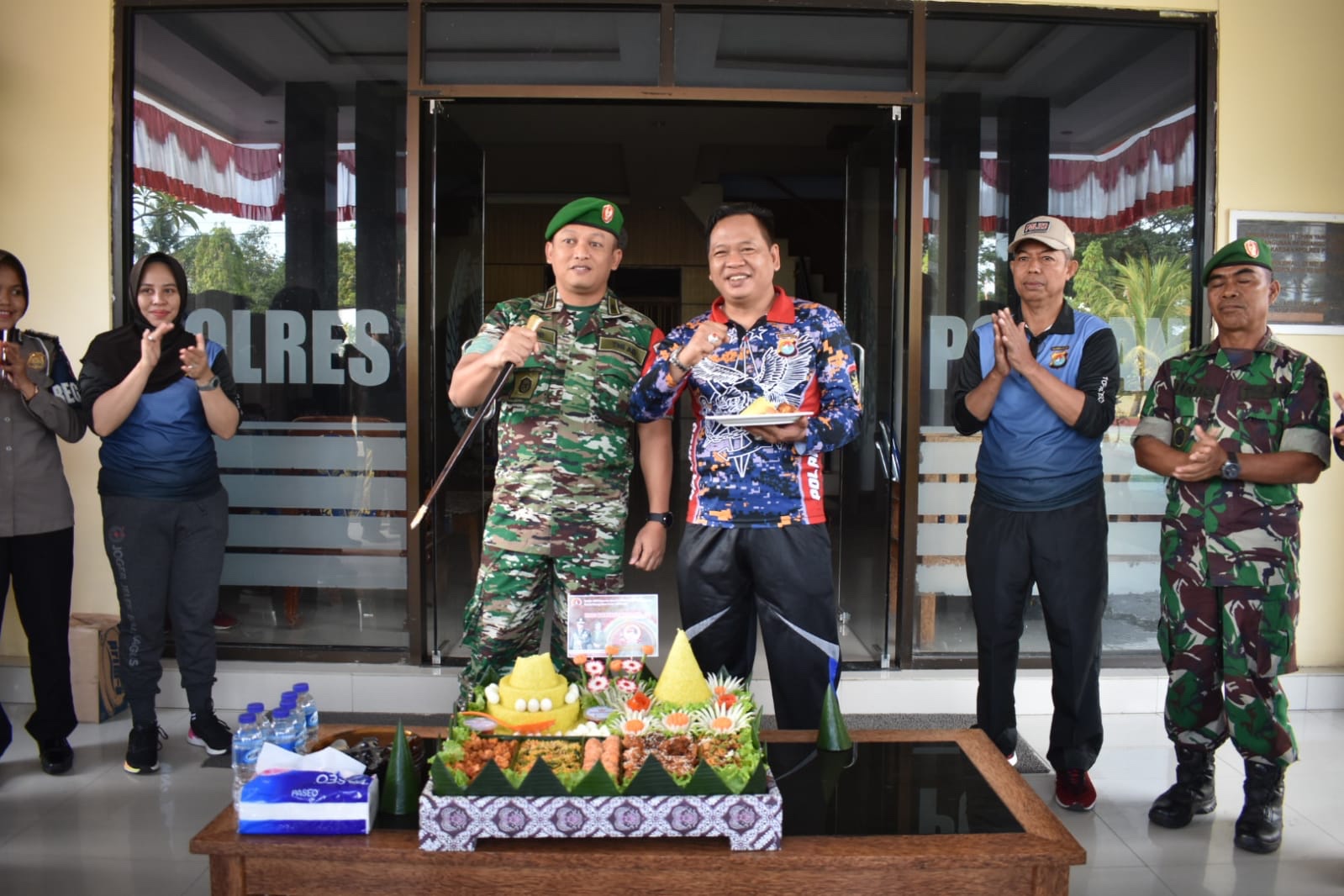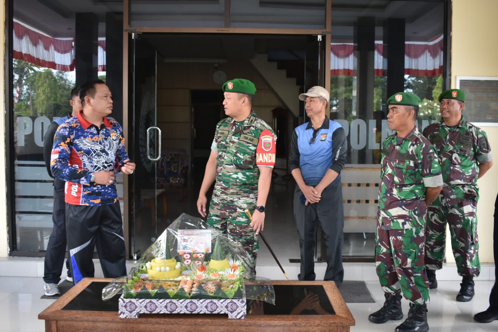 Kehadiran Dandim 1402/Polman bersama rombongan, dengan membawa tumpeng ulang tahun sebagai simbol ucapan selamat disambut oleh Kapolres Polman AKBP Agung Budi Leksono, SH,. S.IK,. M.Pd, bersama staf di Mapolres Polman, Kab. Polman, Jum’at (1/7/2022)