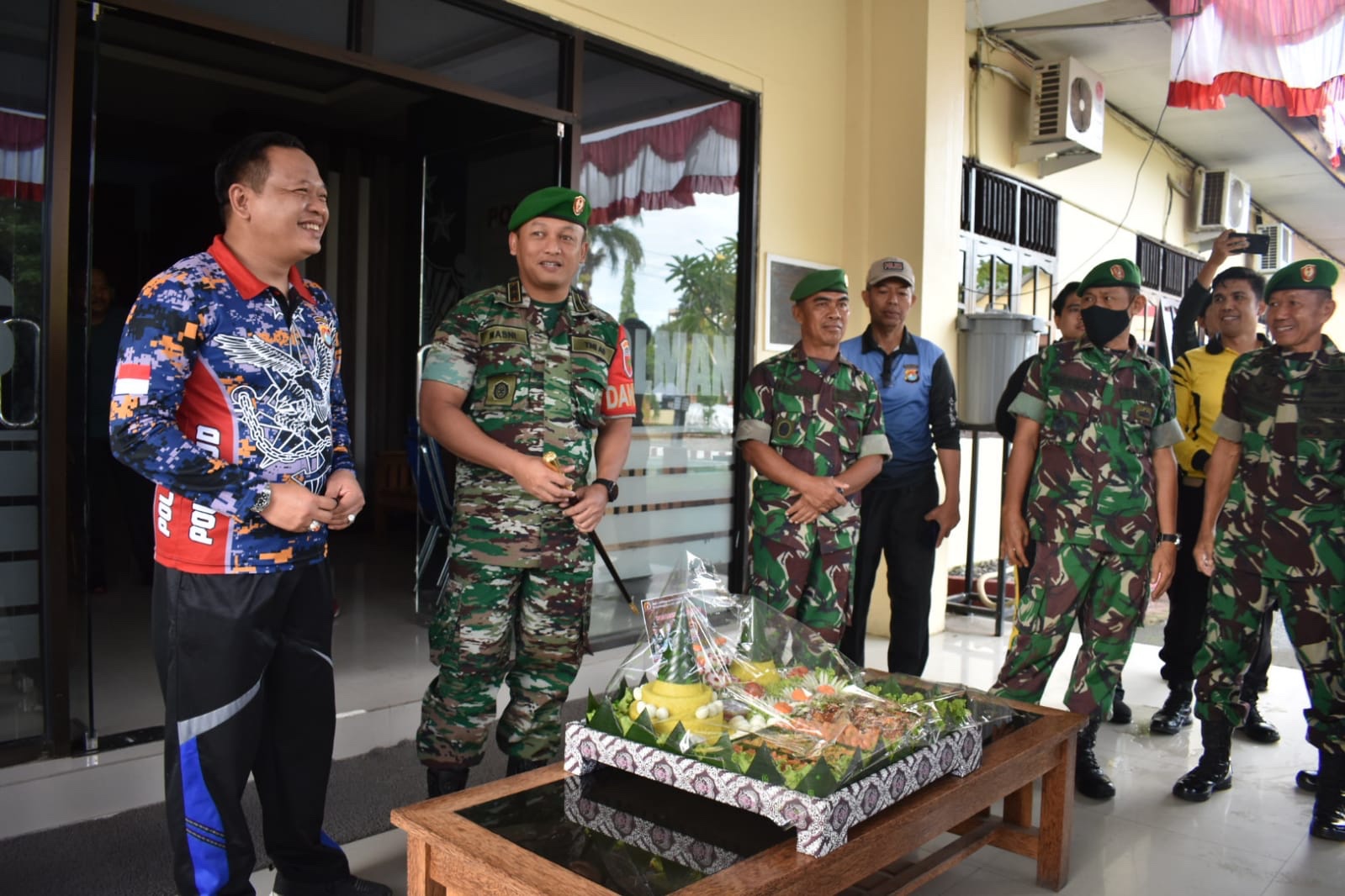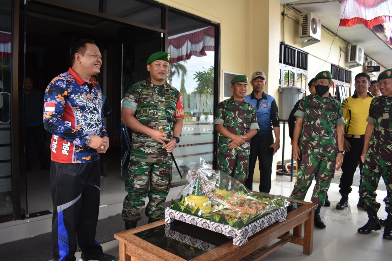 POLMAN- Dandim 1402/Polman Letkol Czi Masni Etha Yanurianedhi, M.Tr.Han, didampingi Perwira staf, Danramil dan anggota Kodim 1402/Polman mendatangi Mapolres Polman memberikan ucapan selamat hari Bhayangkara Ke-76 Tahun 2022.