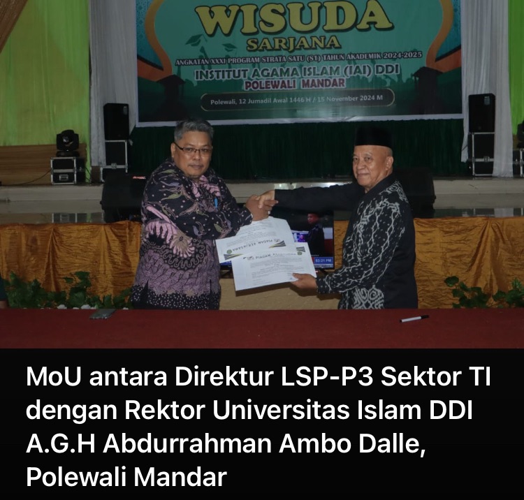 Kerja sama tersebut telah ditandai dengan penandatanganan MoU antara Rektor Universitas Islam DDI A.G.H. Ambo Dalle, Prof. Dr. H. Anwar Sewang, MA., dengan Direktur Eksekutif LSP-P3 Sektor TI, Dr. Muh. Rusli Said, SE., MM., di Polewali, Sulawesi Barat.