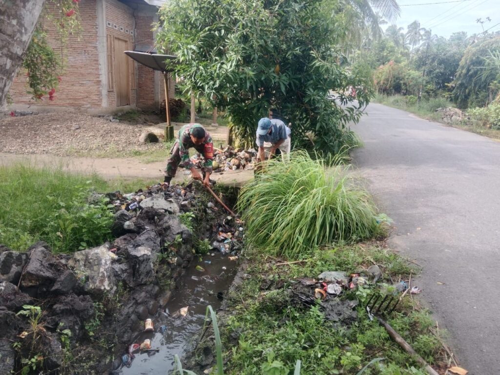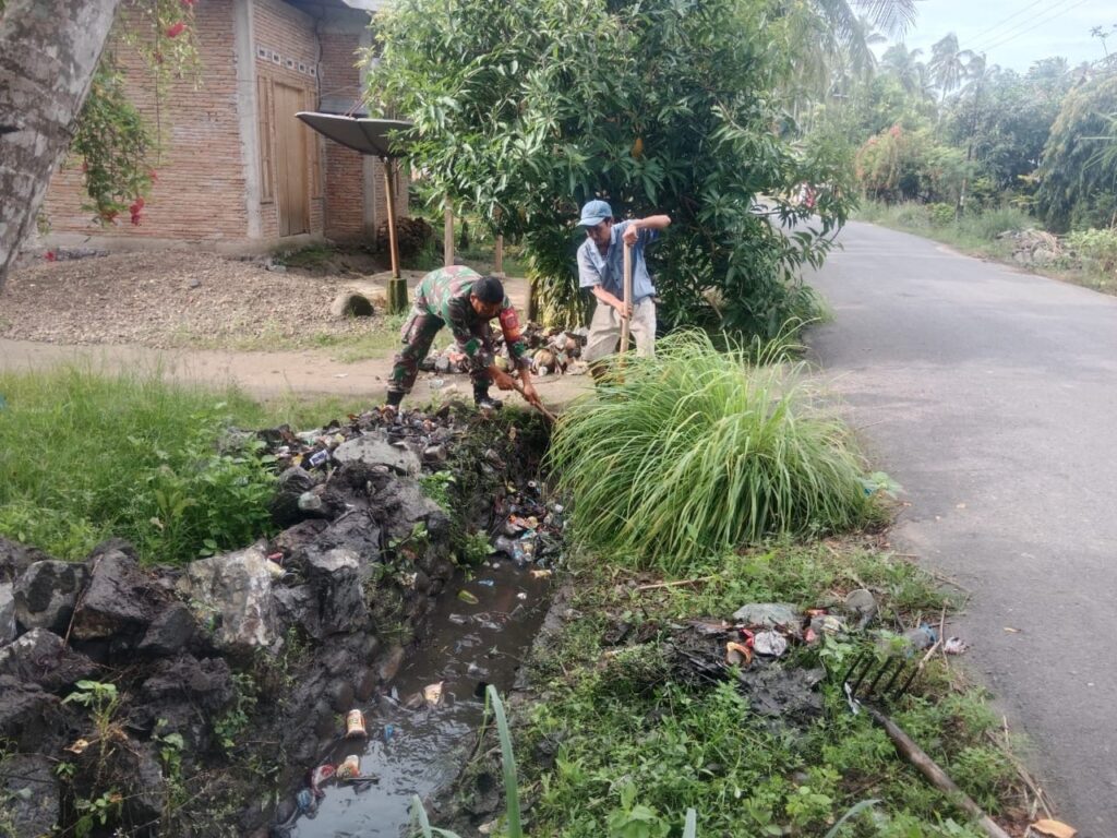 Kerja bakti difokuskan pada pembersihan saluran air dan semak-semak di pinggir jalan desa yang mulai ditumbuhi rumput liar. Dengan menggunakan parang, cangkul, dan peralatan sederhana, Babinsa bersama warga bergotong royong membersihkan area tersebut agar aliran air lancar dan lingkungan tampak rapi.
