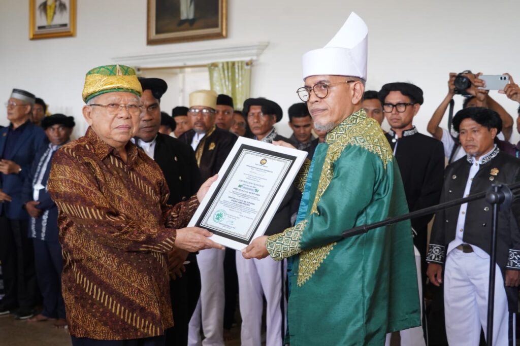 Keesokan harinya, dalam prosesi penuh keagungan adat, Sultan Ternate menganugerahkan Gelar Kesultanan kepada Prof. Ma’ruf Amin sebagai bentuk penghormatan atas dedikasi beliau dalam menjaga nilai persatuan bangsa. Prosesi dilaksanakan di ruang utama Kedaton Kesultanan Sao Sio, disaksikan para Pengurus FKN, Perwakilan Daerah, Perwakilan Keberagaman Nusantara dan Perangkat Adat KesultananTernate, serta unsur Forkompimda Maluku Utara.