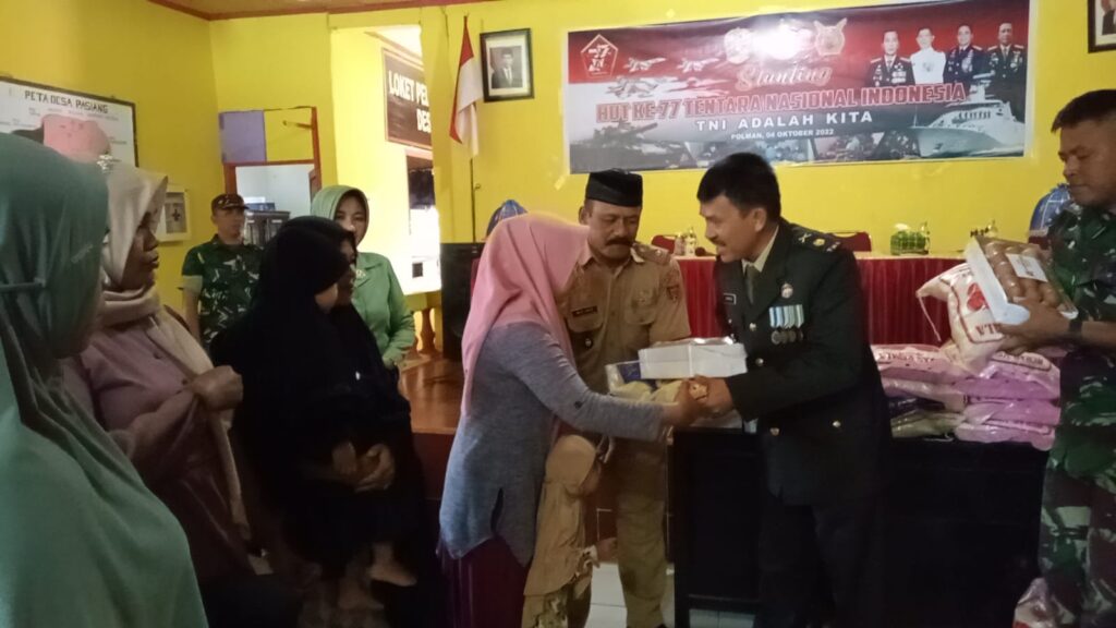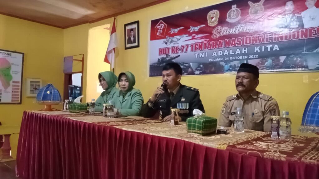 Kepala Staf Kodim 1402/Polman Mayor Inf Ahmad T, S.Sos., M.Si, Mengatakan bahwa dalam rangka menyambut HUT TNI Ke-77 Tahun 2022, Kodim 1402/Polman Menggelar berbagai kegiatan Sosial diantaranya Yang baru saja kita laksanakan hari ini, Yakni pemberian sembako bagi anak stunting di Kampung Pancasila Di Desa Pasiang, Kec. Matakali, Kab. Polman, Sulbar, Selasa (4/10/2022).