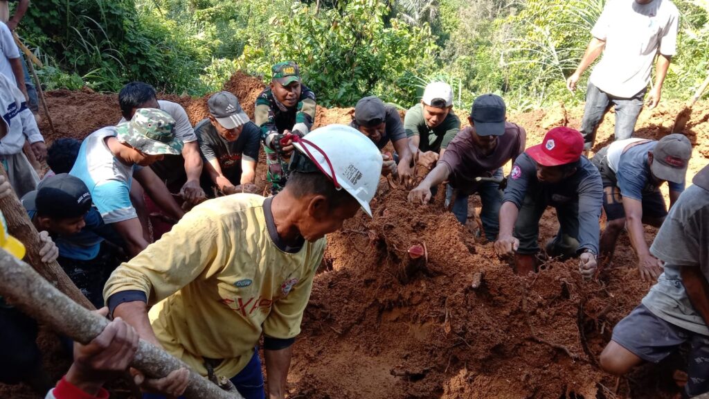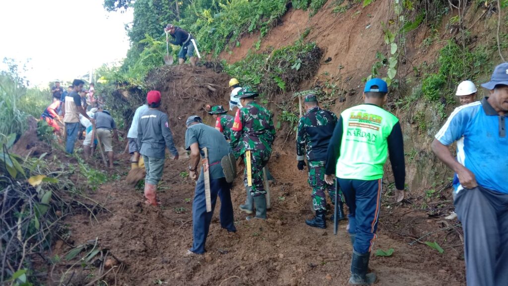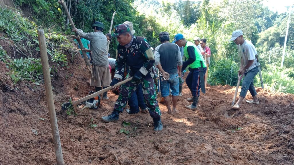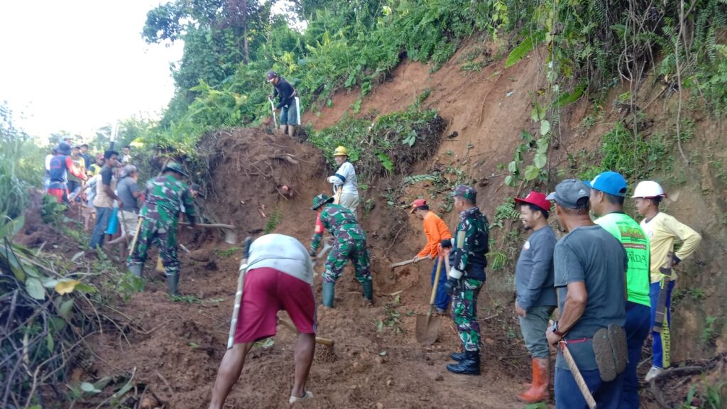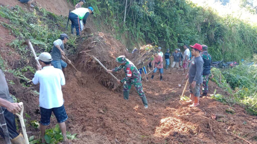independennews.id (Polman) — Anggota Koramil 1402-02/Wonomulyo bersama masyarakat melakukan karya bakti pembersihan material longsor yang menutup badan jalan yang menghubungkan antara dusun Tondoratte menuju dusun Sikka, Desa Landi Kanusuang, Kecamatan Mapilli, Polewali Mandar.