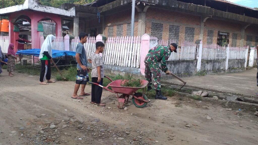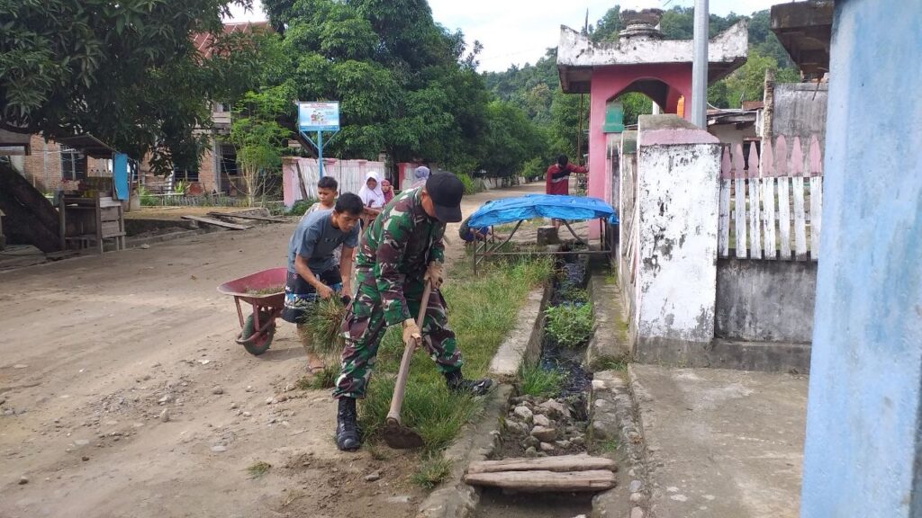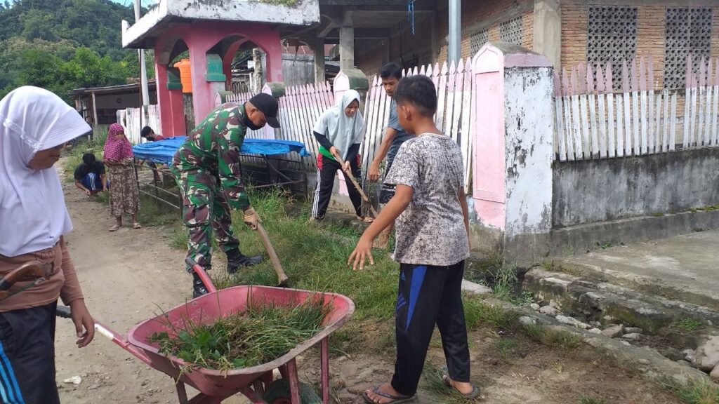 Kegiatan kerja bakti tersebut menyasar pembersihan rumput liar, sampah, serta lingkungan sekitar permukiman warga. Selain Babinsa, sejumlah warga dan anak-anak tampak antusias ikut bergotong royong membersihkan lingkungan desa.