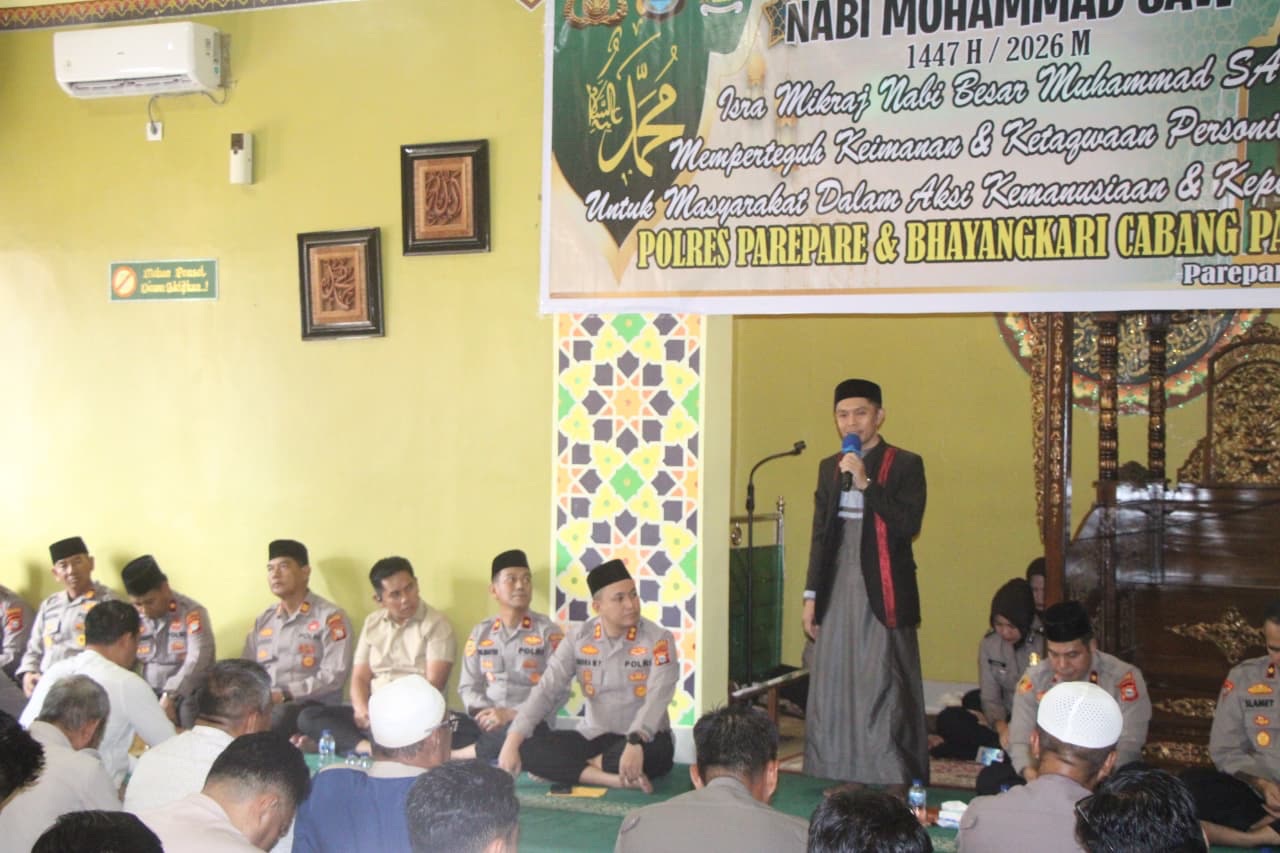 Parepare, independennews.id — Kepolisian Resor (Polres) Parepare menggelar peringatan Isra Mi’raj Nabi Besar Muhammad SAW 1447 Hijriah/2026 Masehi di Masjid Mujahid Baiturrahim, Jalan Muhammad Qurdi, Kelurahan Ujung Baru, Kecamatan Soreang, Kota Parepare, Selasa (27/1/2026) pagi.