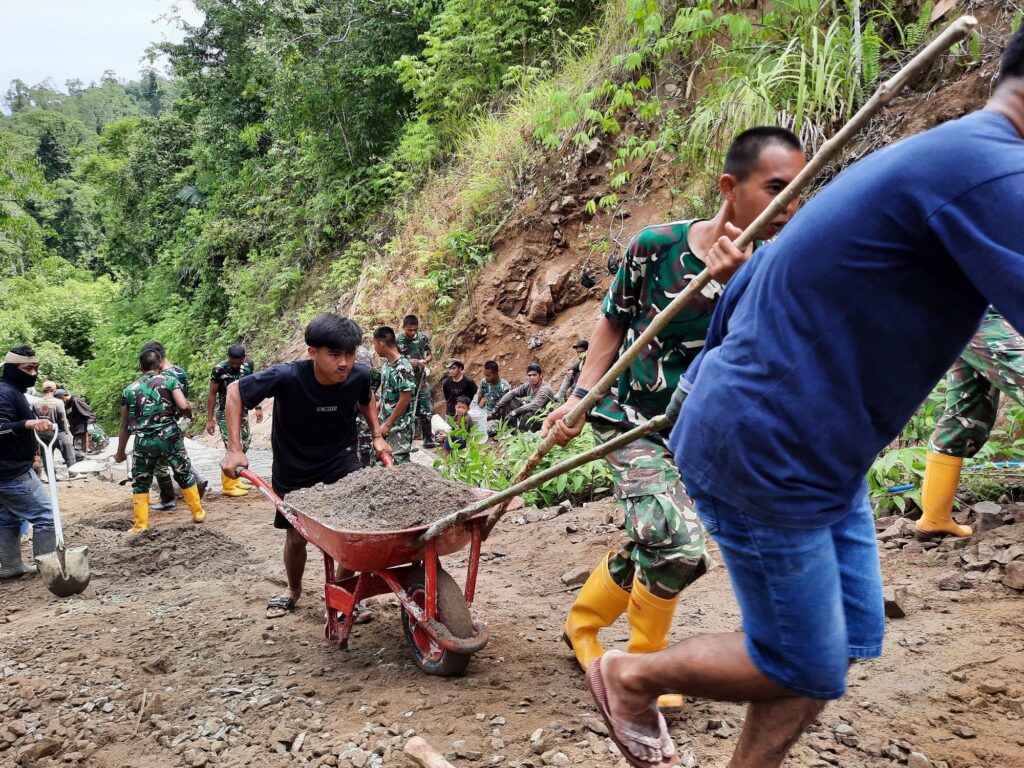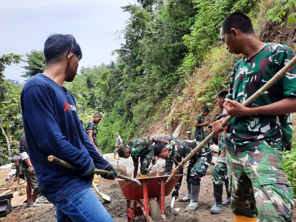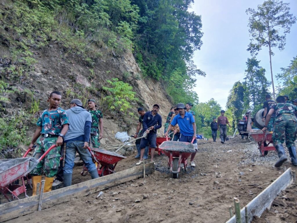 Sejak pagi, anggota TNI dan masyarakat terlihat bahu-membahu mengangkut material, mengaduk campuran semen, hingga meratakan rabat beton di jalur yang selama ini menjadi impian warga. Canda dan tawa sesekali terdengar di sela-sela kerja keras, mencerminkan kebersamaan yang kian erat.