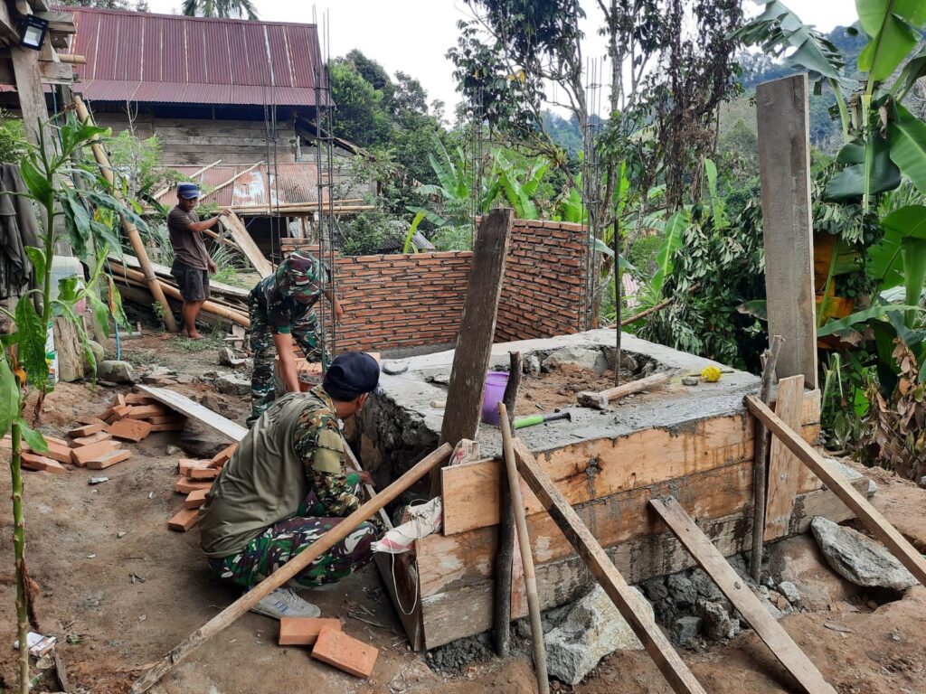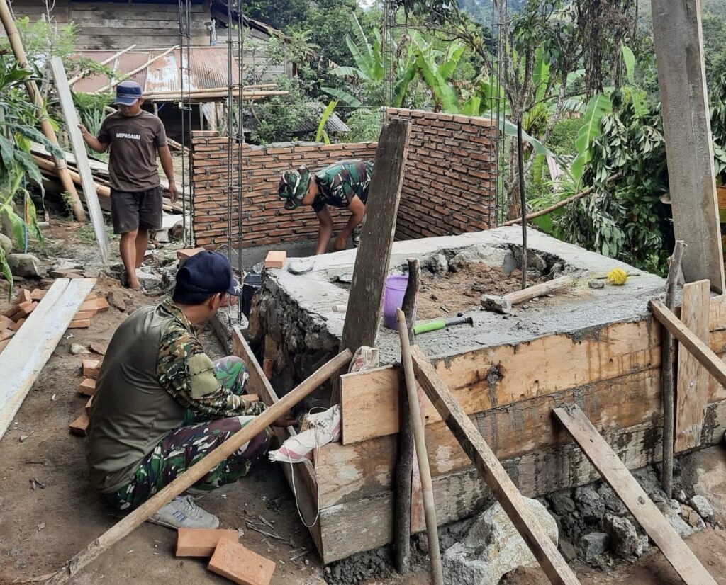 Di lokasi pembangunan, terlihat personel TNI dan warga bahu-membahu menyusun bata dan merapikan pondasi. Di tengah suasana desa yang dikelilingi perbukitan, semangat gotong royong terasa begitu kuat.